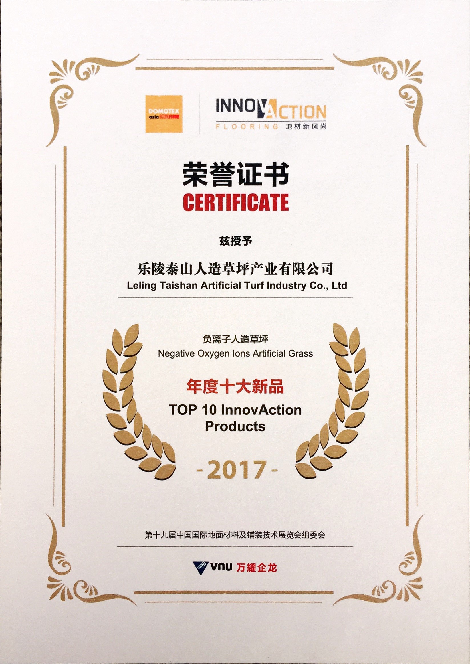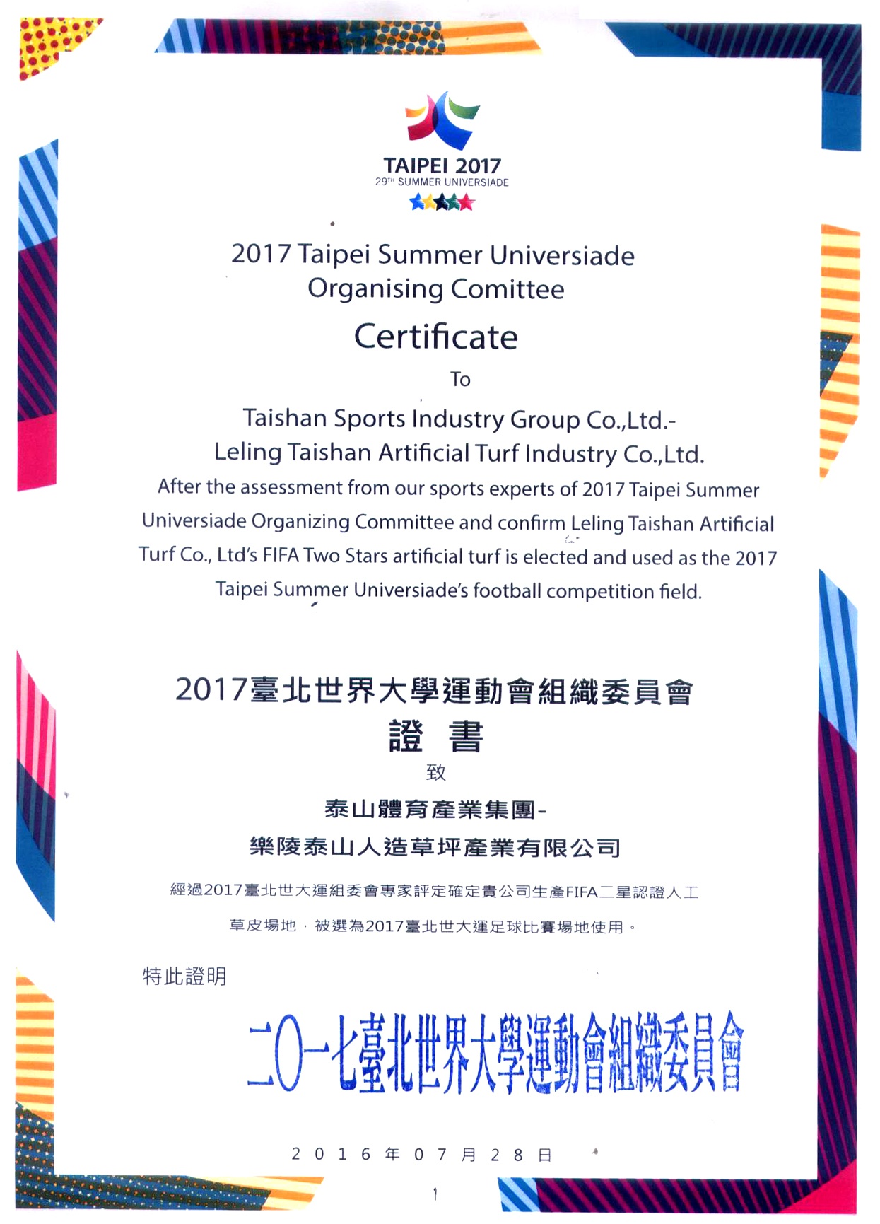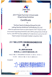 2017台北世界大学运动会组织委员会证书致乐陵庄闲游戏人造草坪产业有限公司